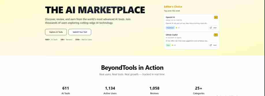 THE AI MARKETPLACE Discover, review, and earn from the world's most advanced AI tools. Join thousands of users exploring cutting edge AI technology BeyondTools in Action Real users. Real tools. Real growth tracked in real time.